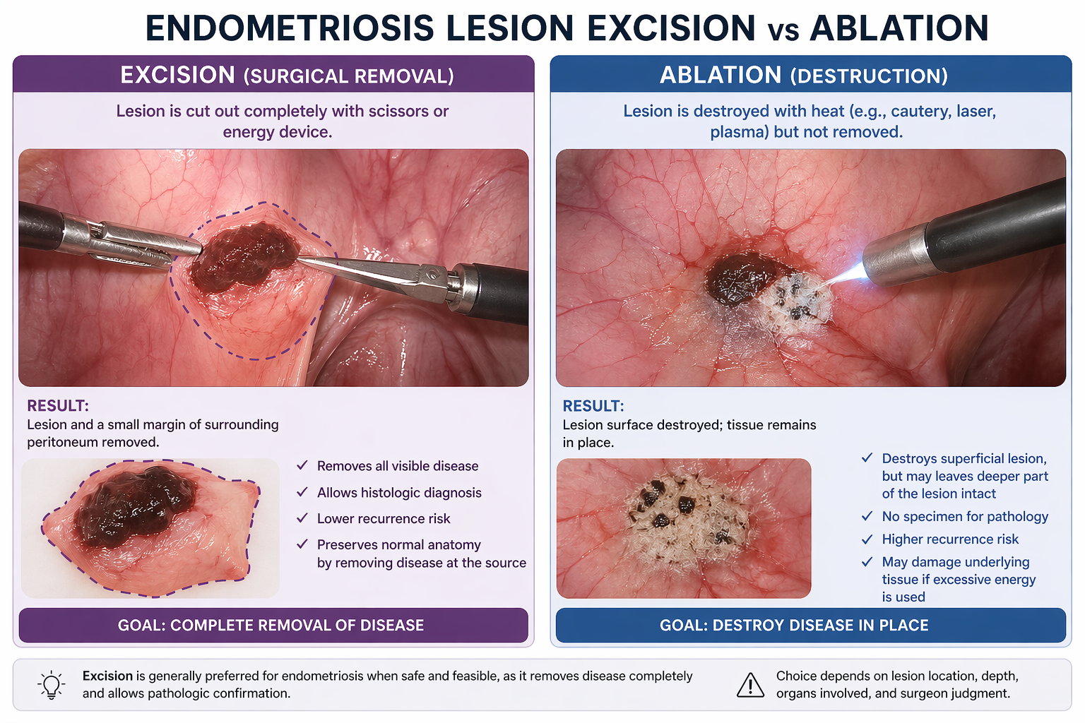 These are the two main surgical techniques used to treat endometriosis, and understanding the difference is critical because they affect outcomes, recurrence, and pain relief.